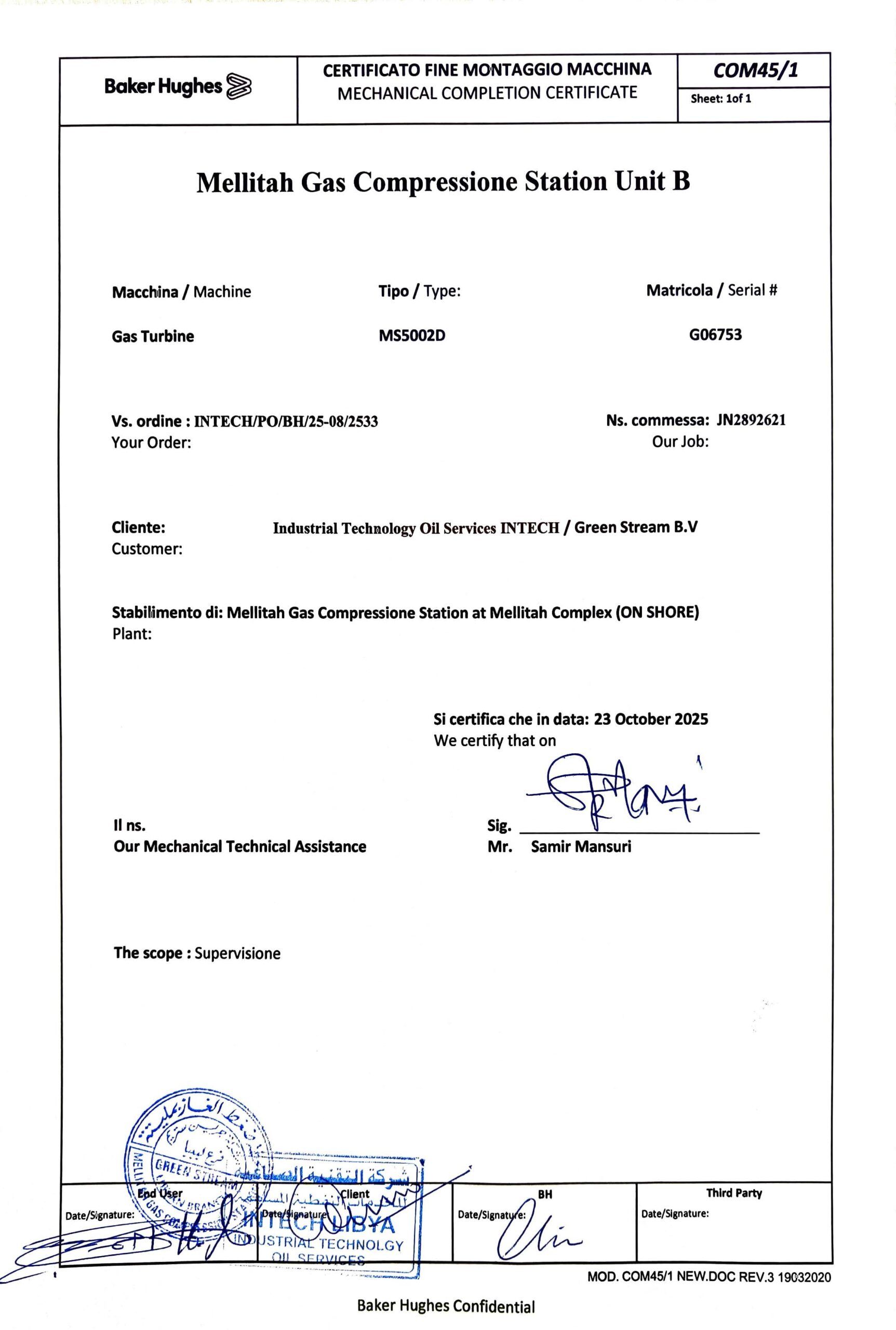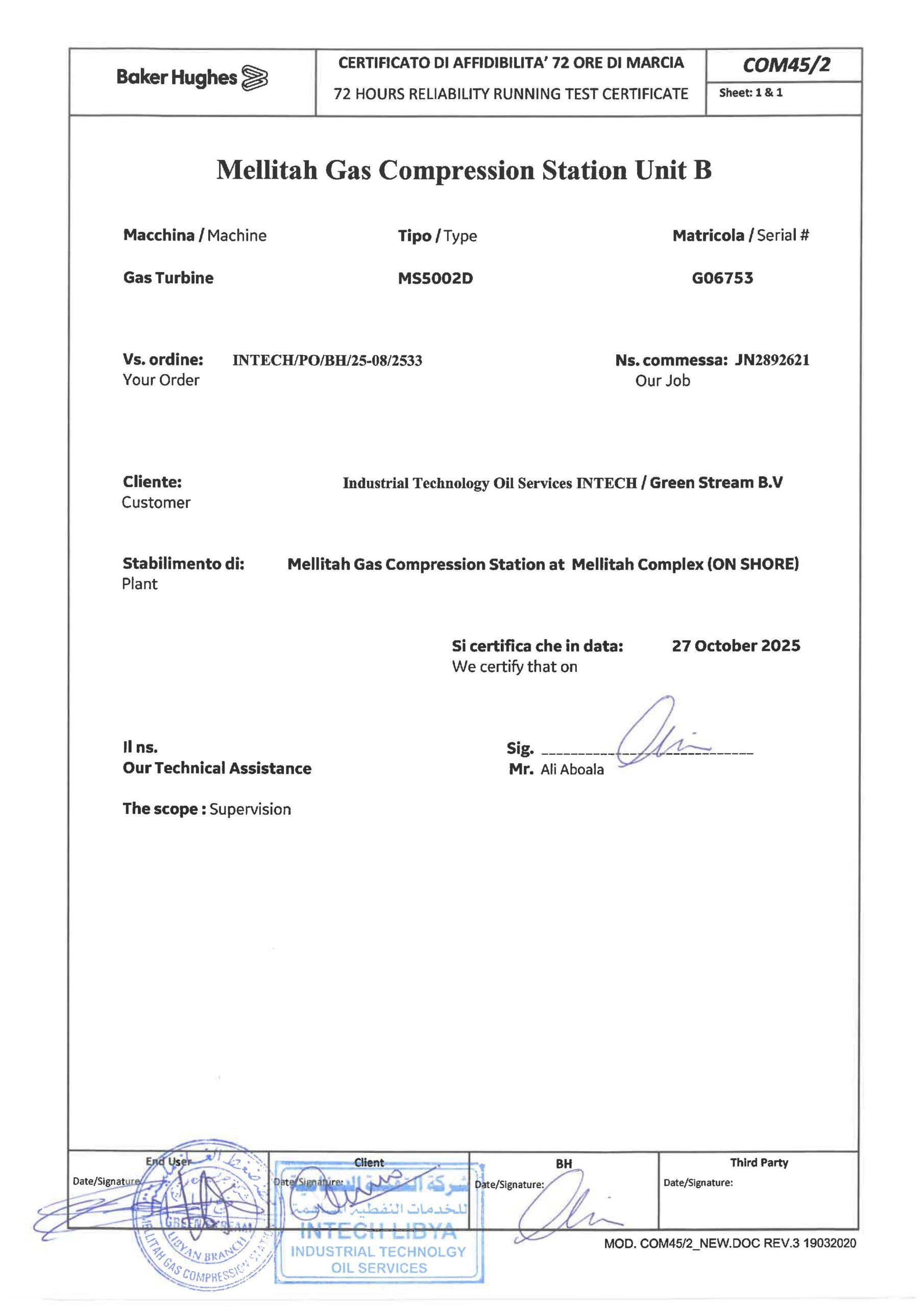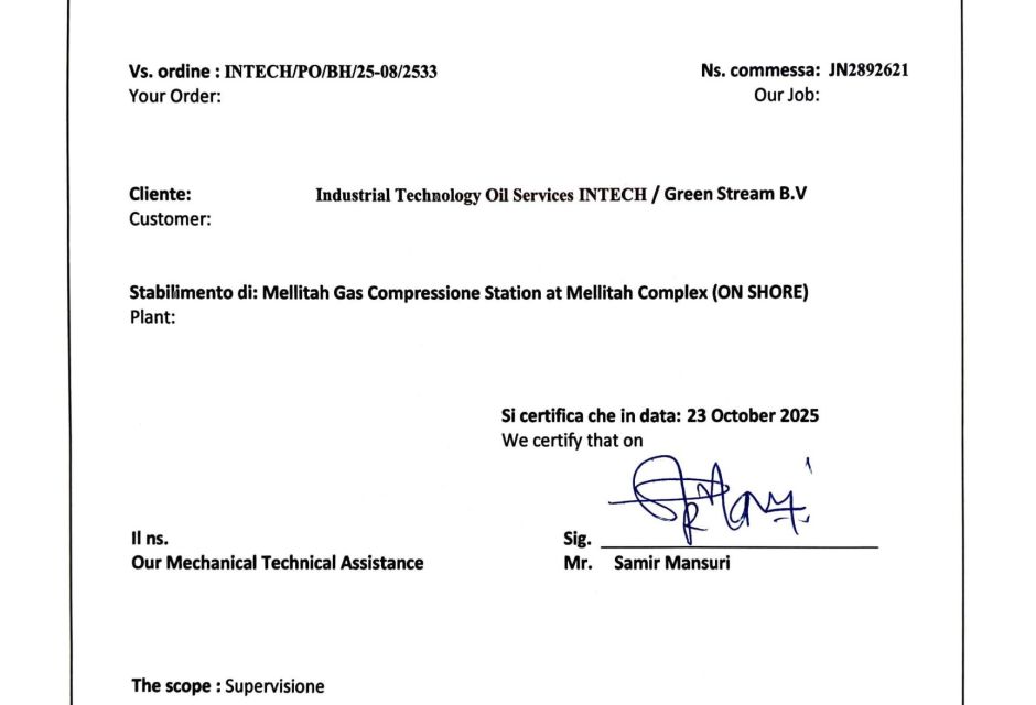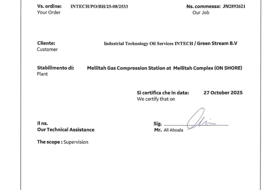 Industrial Technology oil Services (INTECH) is pleased to announce the successful completion of the major inspection and subsequent testing of Gas Compression Station B360 MT 001, Unit #B (Gas Turbine B), at the Mellitah Complex Site.